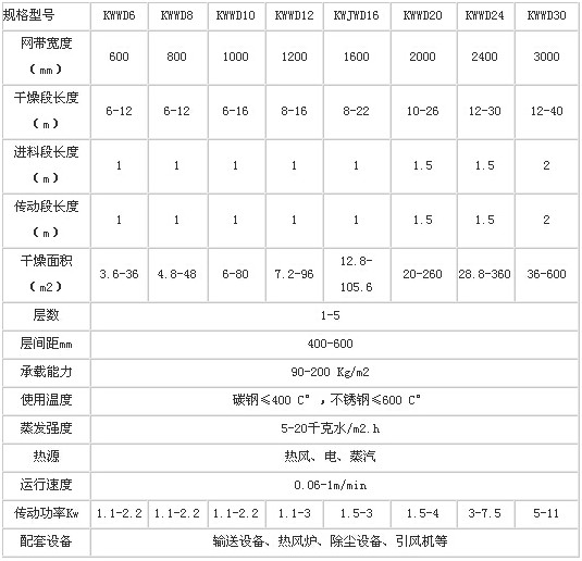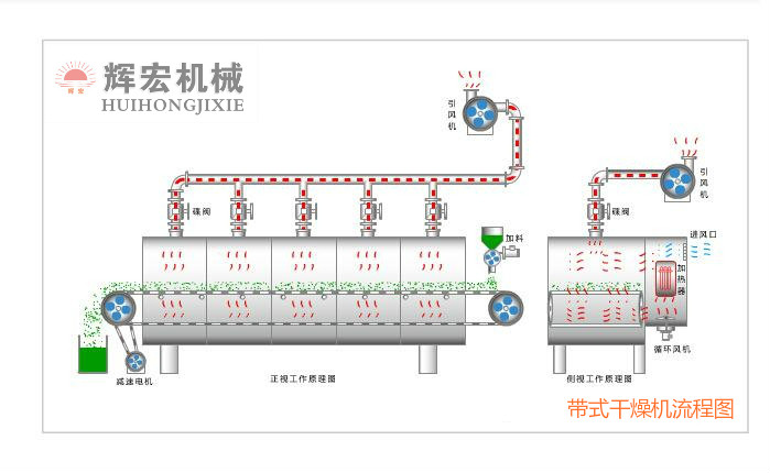 帶式干燥機(jī)有進(jìn)料口、干燥主機(jī)、烘干段、出來端、網(wǎng)帶、傳動裝置、進(jìn)風(fēng)管、出風(fēng)管、風(fēng)機(jī)、熱風(fēng)源等組成。物料有進(jìn)料口進(jìn)入,通過干燥主機(jī)進(jìn)行烘干,網(wǎng)帶的速度視物料的種類和含水量而定。風(fēng)流向采用負(fù)壓、多孔進(jìn)氣、保證有效烘干面積、風(fēng)流風(fēng)速分布均勻提高烘干效果。