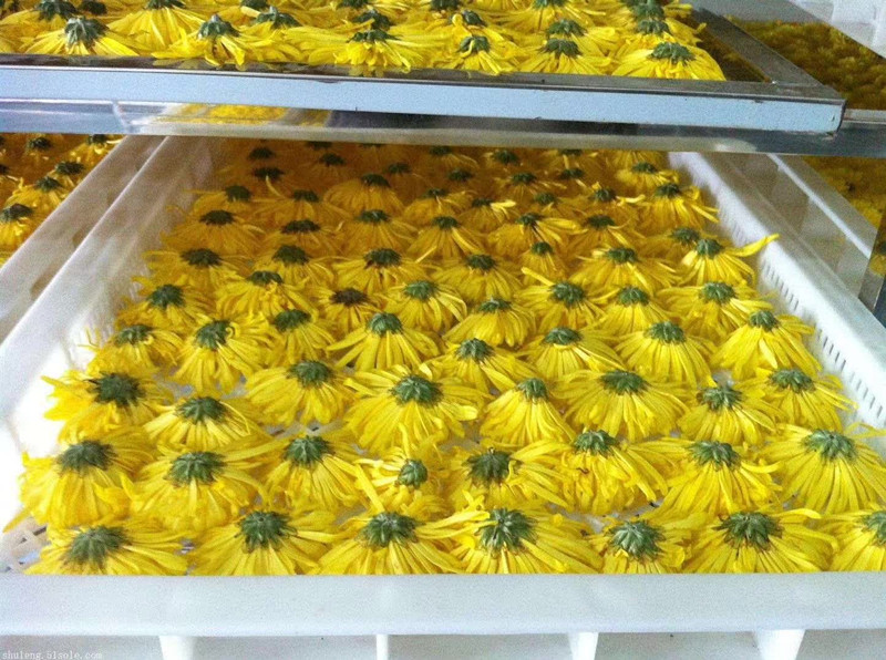 1、在菊花烘干時,首先應將鮮菊花置空氣能熱泵烘干房的物料托盤中,厚度3~5厘米,分段設置烘干的溫濕度,初期,我們設置菊花烘干機的溫度為50攝氏度,干燥時間設定為30分鐘至1.5小時。
